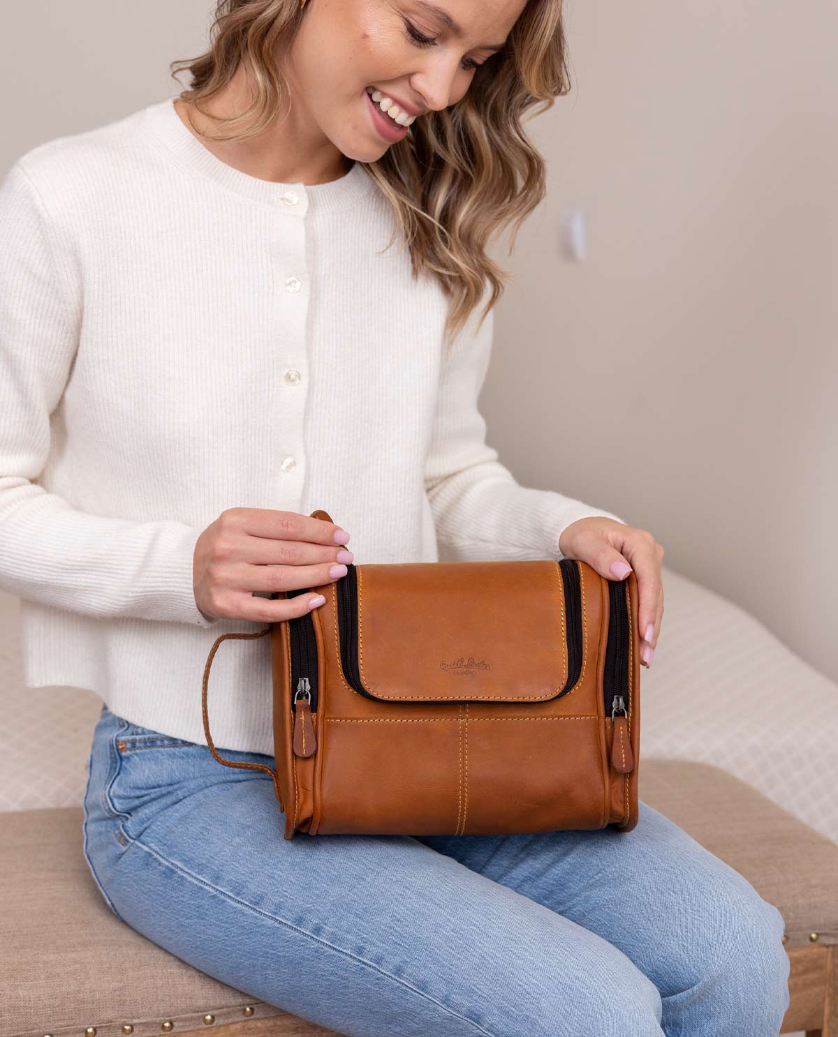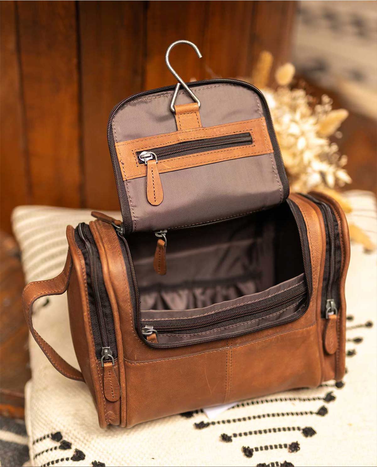 もし小さな妖精だったら、この洗面用ポーチの中でかくれんぼを楽しむことができるでしょう。「Chester」は、すべての衛生用品を収納するための驚くほど多くのポケットを備えています。多機能なポケットが特徴の「Chester」は、すべてのアイテムをきちんと収納できる実用性も提供します。両サイドのポケットには必要なものがしっかりと収まります。また、便利なフックを使えば、世界中どこのバスルームでも「Chester」を簡単に吊り下げて使用できます。内側は撥水加工されているため、シャンプーの漏れなどの小さな事故にも対応できます。そして、Gusti Lederでは機能性だけでなく、デザイン性も重視しているため、この洗面用ポーチも非常にスタイリッシュな仕上がりとなっています。さらに、スタイリッシュな明るいブラウンとエレガントな濃いブラウンの2色からお選びいただけます。これ以上何を求めるでしょうか?このスマートな洗面用ポーチがあれば、旅行中も妥協することなく、いつでも完璧に準備が整います。