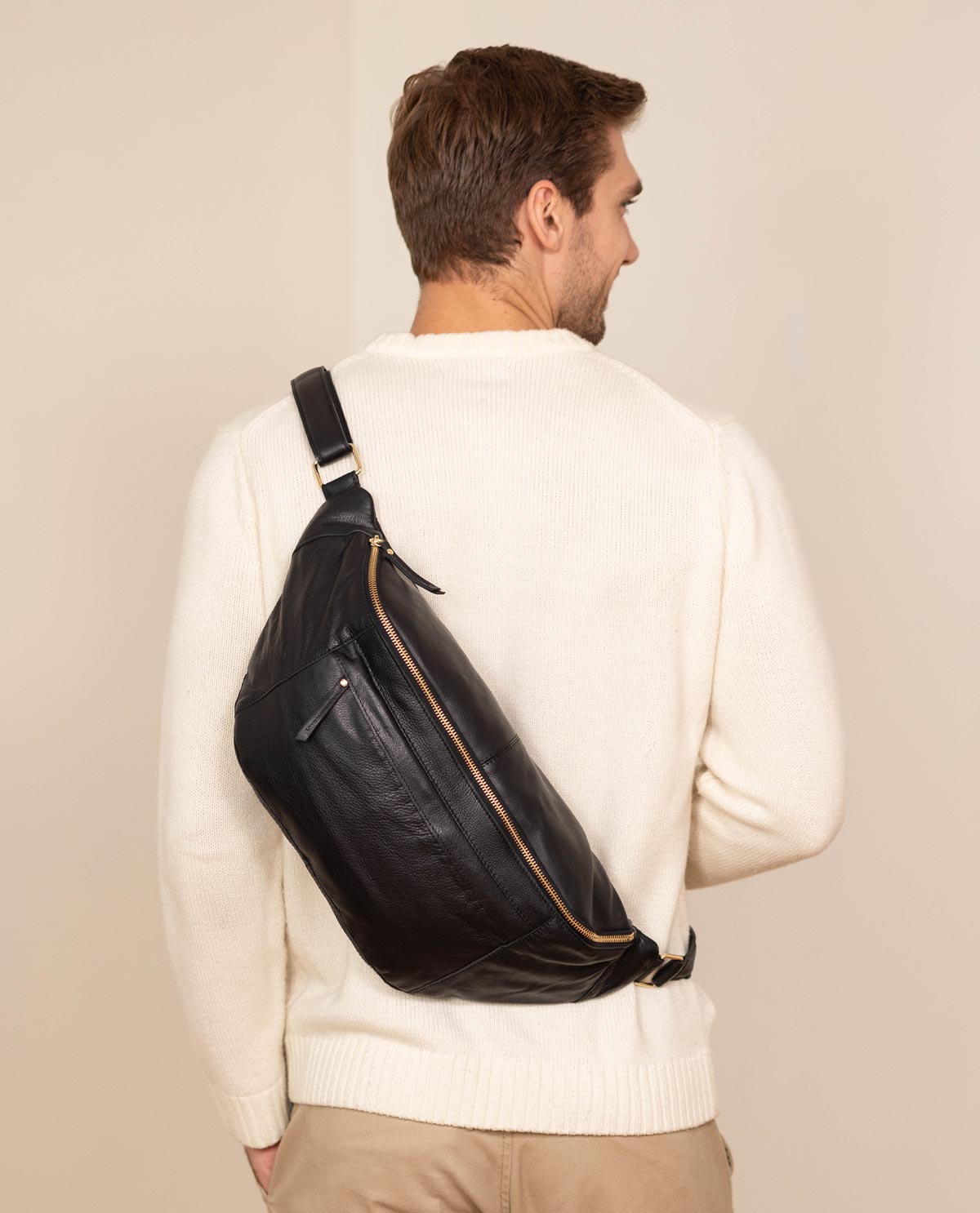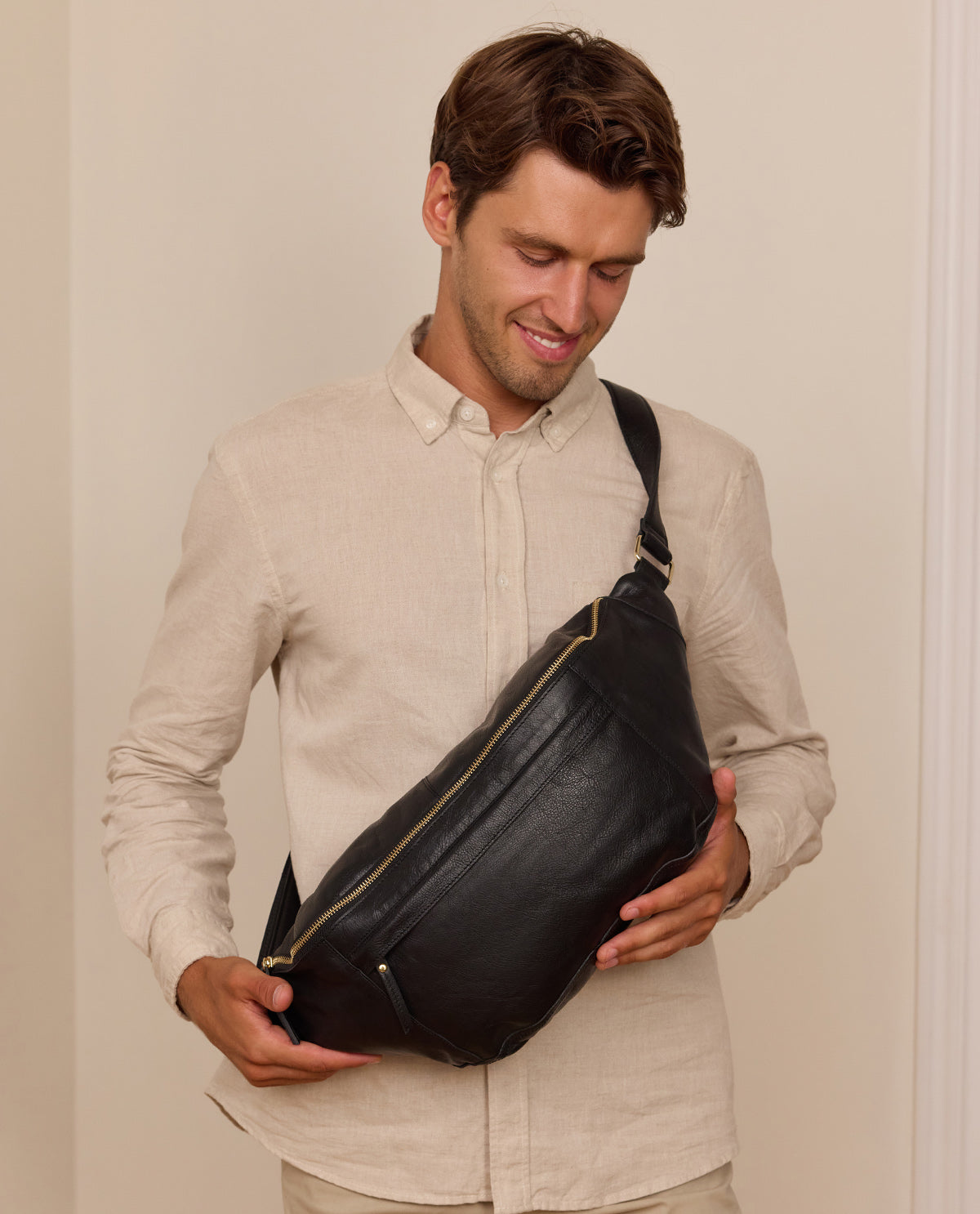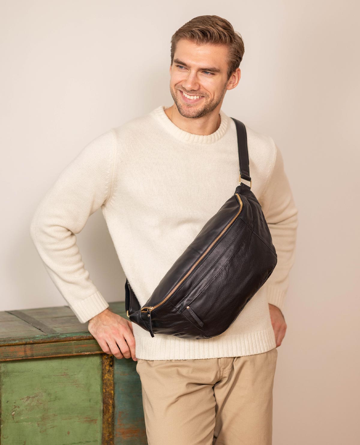 Denn diese geräumige Tasche aus widerstandsfähigem Büffelleder im Format einer großen Bauchtasche kombiniert alle Vorteile eines kompakten Rucksacks mit dem absolut angesagten, lässig-coolen Bellybag-Style - nicht zuletzt auch wegen der angenehm-weichen Beschaffenheit des Leders und dem Chic goldfarbener Reißverschlüsse. Auf diese Weise kann Dich "Esben" überall hin begleiten, ohne dass Du auf deine liebsten Habseligkeiten oder einen coolen Auftritt verzichten musst. Schließlich bietet "Esben" für Dein Smartphone, Schlüssel und Portemonnaie, Taschenkalender, Stifteetui und noch einiges mehr einfach immer genügend Platz!