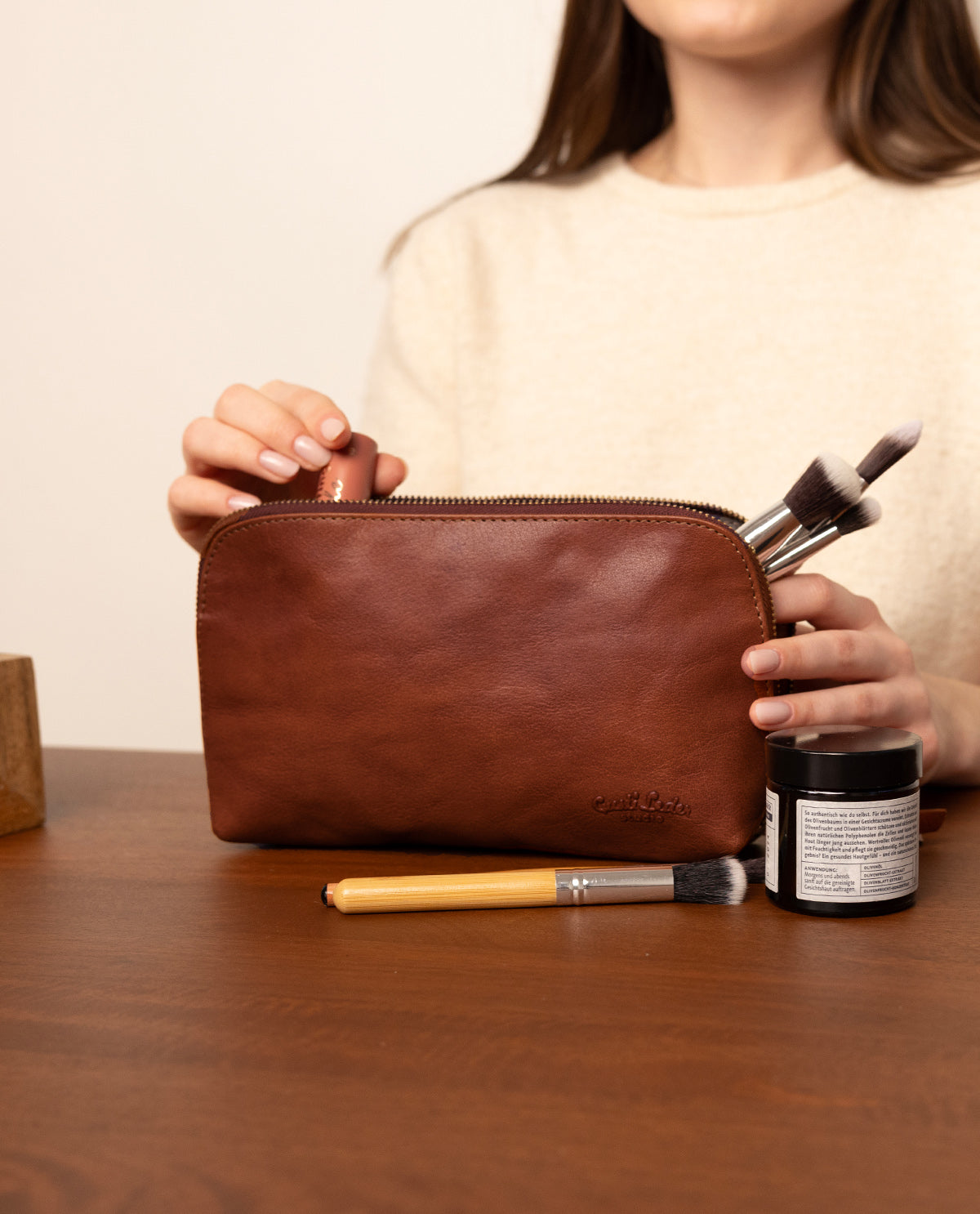 Ob für Geschäftsreisende oder Reisende, für den Trip zwischendurch oder als Aufbewahrungsort für dein Make-up! „Eli“ vereint Funktionalität mit einem lässigen Vintage-Look. Das hochwertige Büffelleder und die praktische Größe sorgen nicht nur für die perfekte Organisation, sondern machen den Kulturbeutel auch zu einem stilvollen Begleiter. Der praktische Reißverschluss und das durchdachte Design bieten ausreichend Platz für alle wichtigen Hygieneartikel, wie Deo, Shampoo, Conditioner, Zahncreme und vieles mehr. Für extra Alltagstauglichkeit ist „Eli“ innen mit einem wasserabweisenden Futter ausgestattet – so lässt sich alles leichter sauber halten. Inspiriert durch Berlin, ist „Eli“ der perfekte Begleiter für alle, die auf Funktionalität und Stil Wert legen.