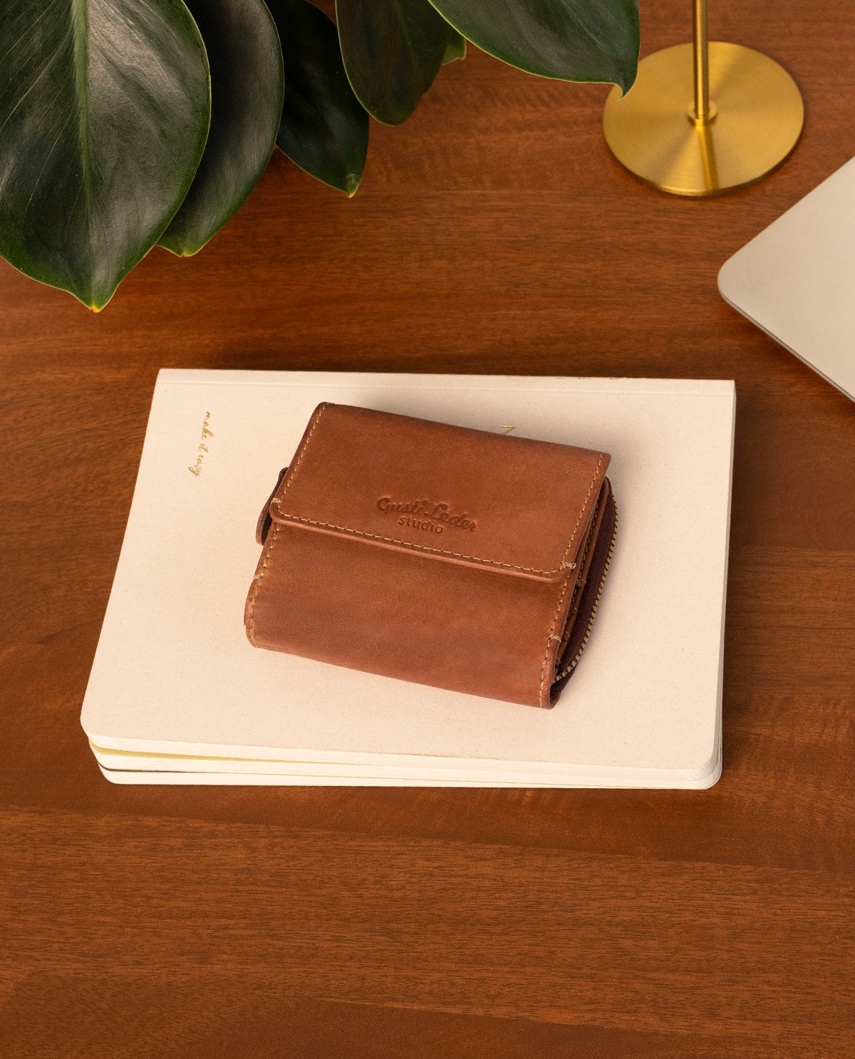 Im Inneren verfügt „Brigitta“ über ein Geldscheinfach, ein ausklappbares Sichtfenster, Platz für bis zu sechs Karten sowie ein separates Münzfach mit Reißverschluss, das verhindert, dass Münzen unkontrolliert herausfallen. Aus hochwertigem Büffelleder gefertigt, wird das Portemonnaie sicher mit einem Druckknopf verschlossen. So bist Du jederzeit bereit für den Tag. Der integrierte RFID-Blocker in der Geldbörse stört die Signale von Lesegeräten, schützt Deine Karten und sorgt für die Extraportion Sicherheit.