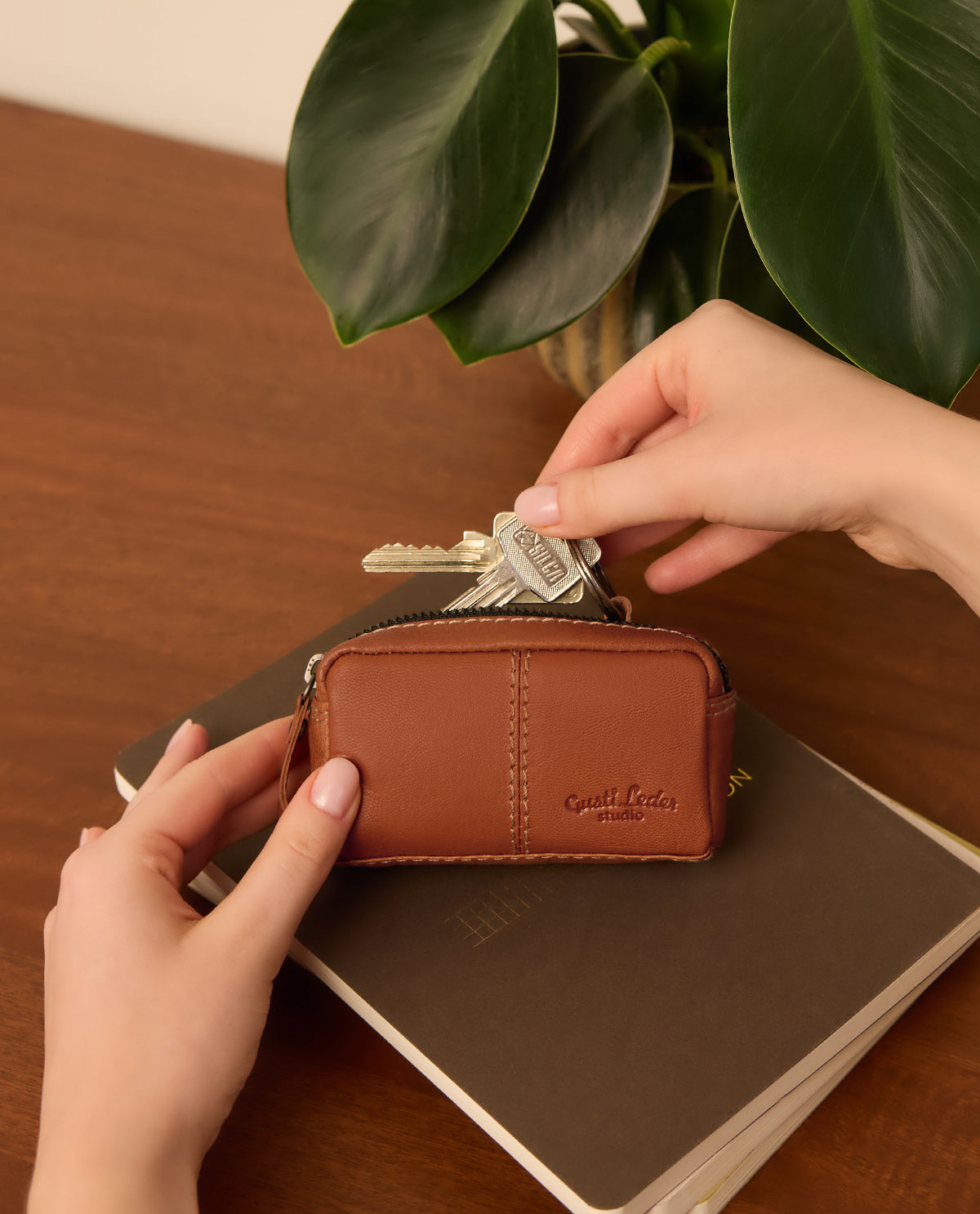 "Butler" hat ein kompaktes Hosentaschenformat und ist mit zwei separaten Fächern ausgestattet, die beide mit einem Reißverschluss schließen. Das größere Fach wartet - wie es sich für ein Schlüsseletui eben gehört - mit einem inneliegenden Schlüsselring für Deine Schlüssel auf, das kleinere Fach eignet sich derweil hervorragend für etwas Münzgeld, einen Einkaufs-Chip oder den einen oder anderen gefalteten Geldschein. Das für dieses Accessoire hochwertig verarbeitete Echtleder gibt "Butler" unterdessen Halt und Stabilität und macht es zu einem widerstandsfähigen Helfer für Deinen Alltag - ganz "Butler" eben.