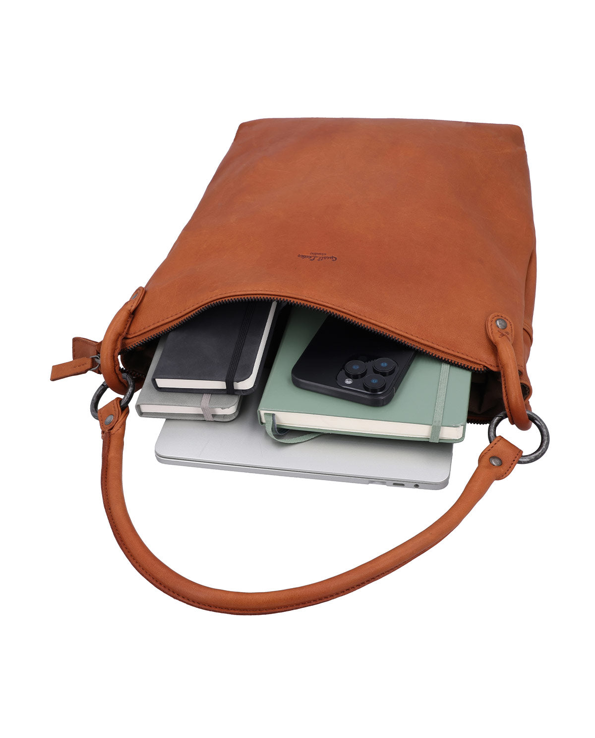 „Cathy“ bietet nicht nur viel Stauraum, sondern auch durchdachte Funktionen: Ein integriertes Laptopfach schützt Deine Geräte bis zu 13" sicher, während das Innenfach mit Reißverschluss Platz für kleine Wertgegenstände bietet. Die externe Reißverschlusstasche auf der Rückseite sorgt für schnellen Zugriff auf Dinge, die Du unterwegs schnell zur Hand haben möchtest. Mit dem Lederpatch für eine Gravur im Inneren erhält die Tasche eine persönliche Note, die das hochwertige Design unterstreicht. Ideal für Damen, die sowohl Stil als auch Funktionalität schätzen.
