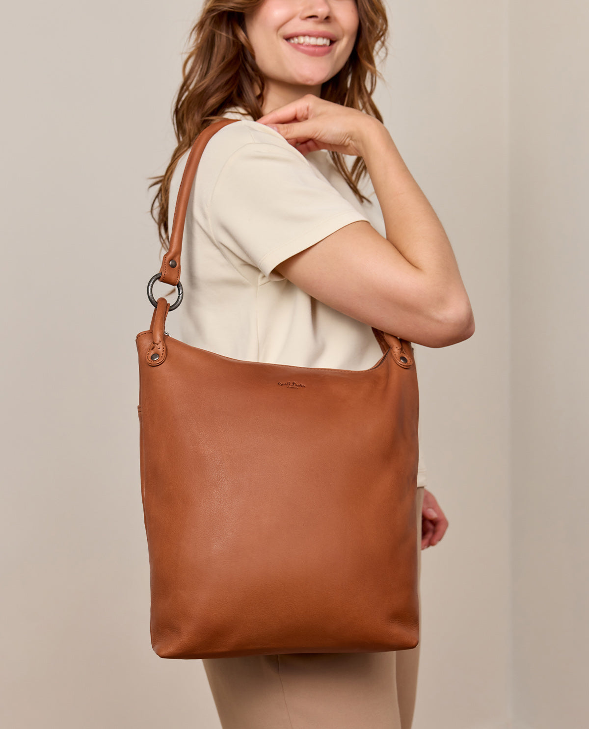 Der "Cathy" Shopper ist die perfekte Mischung aus praktischer Funktionalität und elegantem Design. Gefertigt aus hochwertigem braunem Leder, überzeugt sie mit robusten, runden Griffen, die durch Metallringe verstärkt und mit X-genähtem Lederdetail versehen sind. Der Reißverschluss mit Ledergriff sorgt dafür, dass Deine persönlichen Gegenstände jederzeit sicher und geschützt sind. Das großzügige Innenfach, das mit strapazierfähigem Baumwollstoff ausgekleidet ist, bietet ausreichend Platz für alles, was Du im Alltag benötigst.