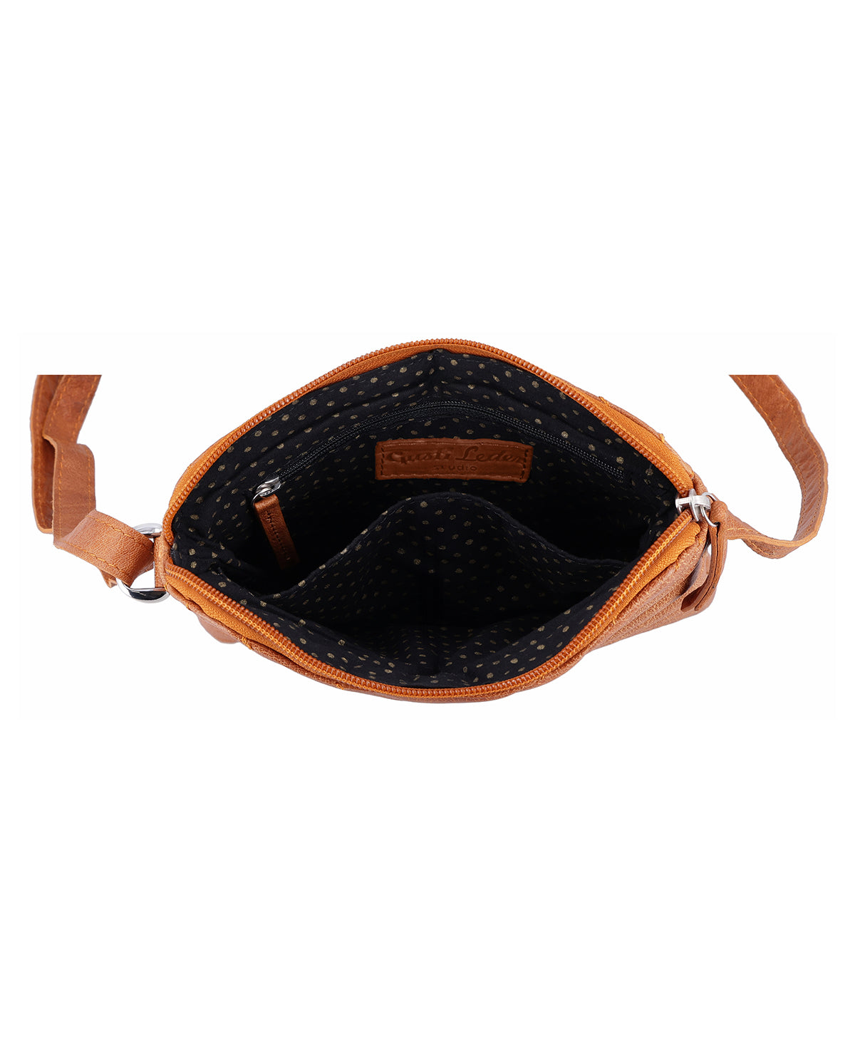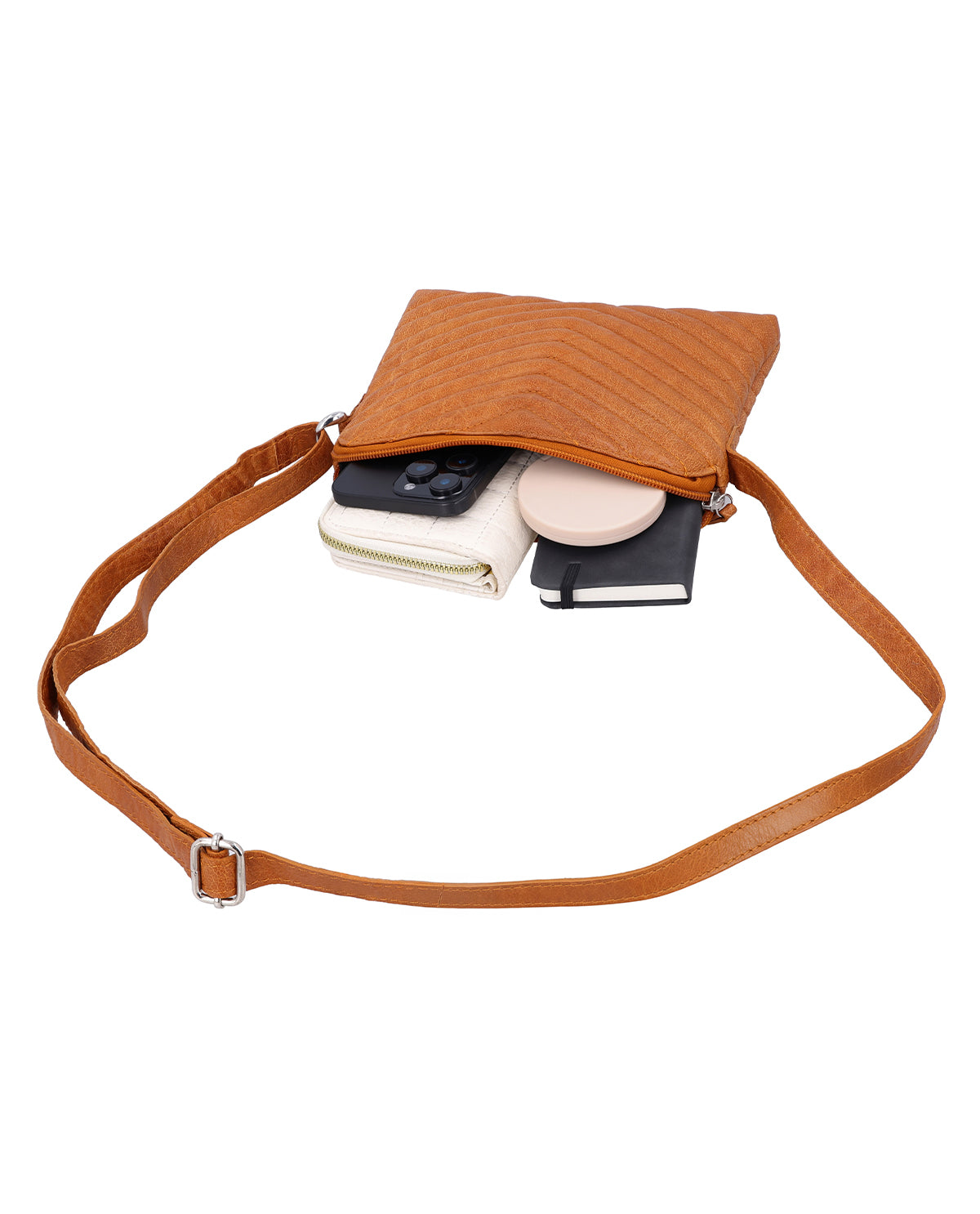 Die kleine Handtasche „Aline“ ist eine Lederhandtasche für Damen, die Farbe und Struktur bewusst in ihren Alltag integrieren möchten. Das braune Leder wirkt lebendig und wird durch das markante Muster auf der Oberfläche zu einem besonderen Hingucker, der Deinem Outfit sofort Leichtigkeit verleiht. Trotz ihres kompakten Formats bietet „Aline“ dank Reißverschluss-Hauptfach und verstellbarem Schulterriemen genau die Flexibilität, die Du im Alltag brauchst. Diese Umhängetasche aus Leder begleitet Dich entspannt durch den Tag und setzt dabei ein klares, positives Stilstatement.