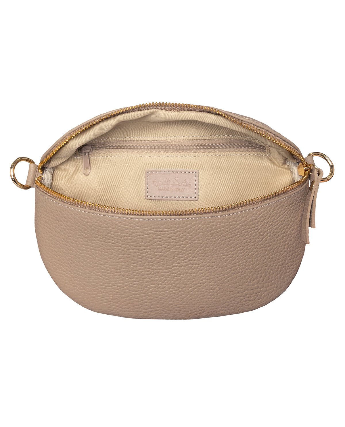 Die "Brinja" Umhängetasche besticht durch ihr elegantes Design und ihre hohe Funktionalität. Mit der markanten, halbrunden Silhouette und dem vollständigen Reißverschluss entlang des oberen Randes bietet sie nicht nur ausreichend Platz für Deine Essentials, sondern auch Sicherheit für all Deine persönlichen Gegenstände. Das hochwertige Leder verleiht ihr eine edle Optik, die sich perfekt in Deinen modernen Alltag einfügt. Im Inneren findest Du zudem das fein eingeprägte "Made in Italy"-Logo, das die Herkunft und Qualität dieser Tasche eindrucksvoll unterstreicht.