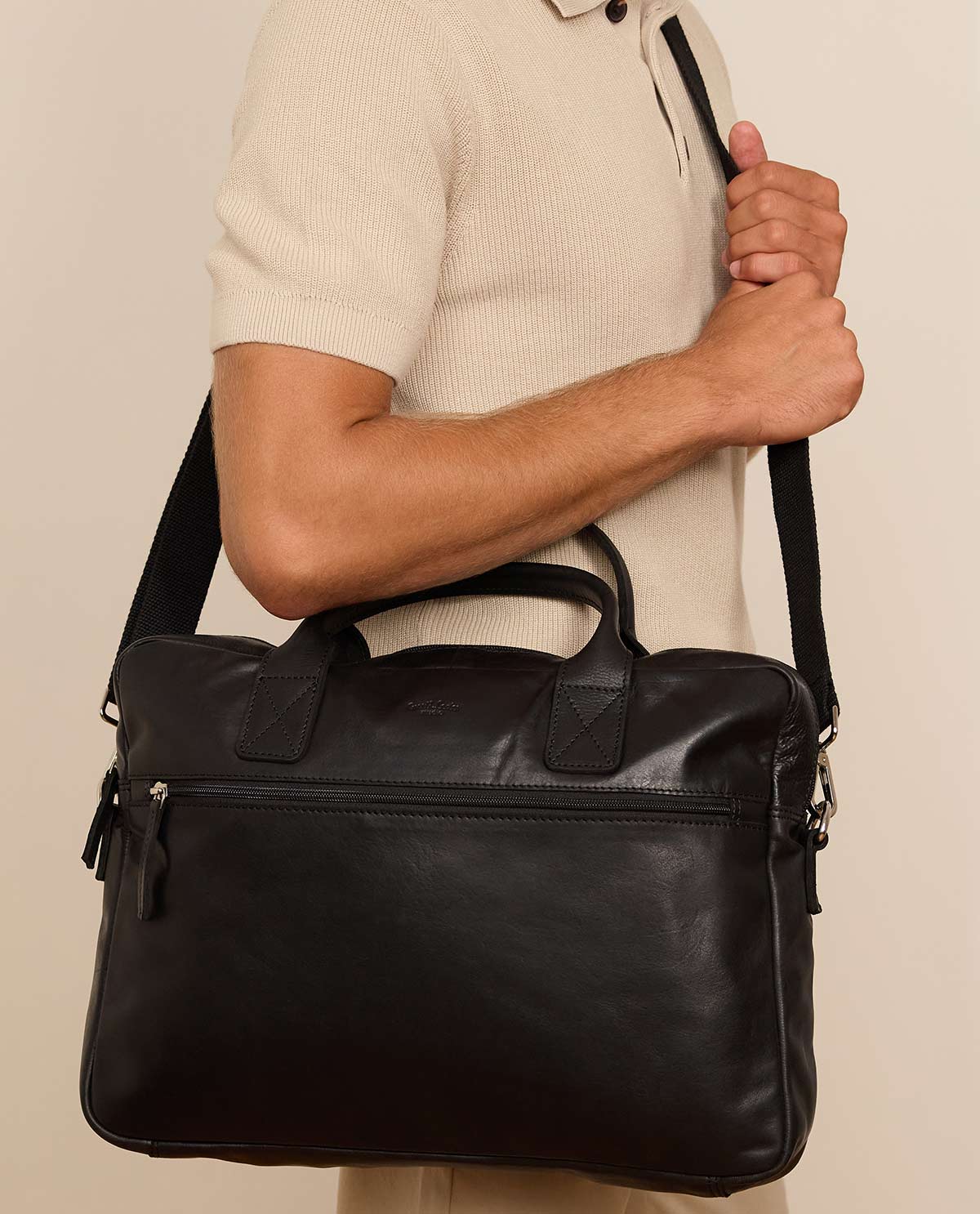 The "Elijah" is the perfect combination of style and functionality for the modern business look. Made from high-quality leather, this briefcase offers a rustic elegance that is sure to catch everyone's eye. It provides ample space for your important documents, your laptop, tablet, file folder, and much more. Thanks to the adjustable shoulder strap, you can conveniently carry the bag as a shoulder bag, keeping both hands free at all times. The bag is also equipped with a practical front pocket with a zipper, providing additional storage space for your important items like a smartphone or wallet.