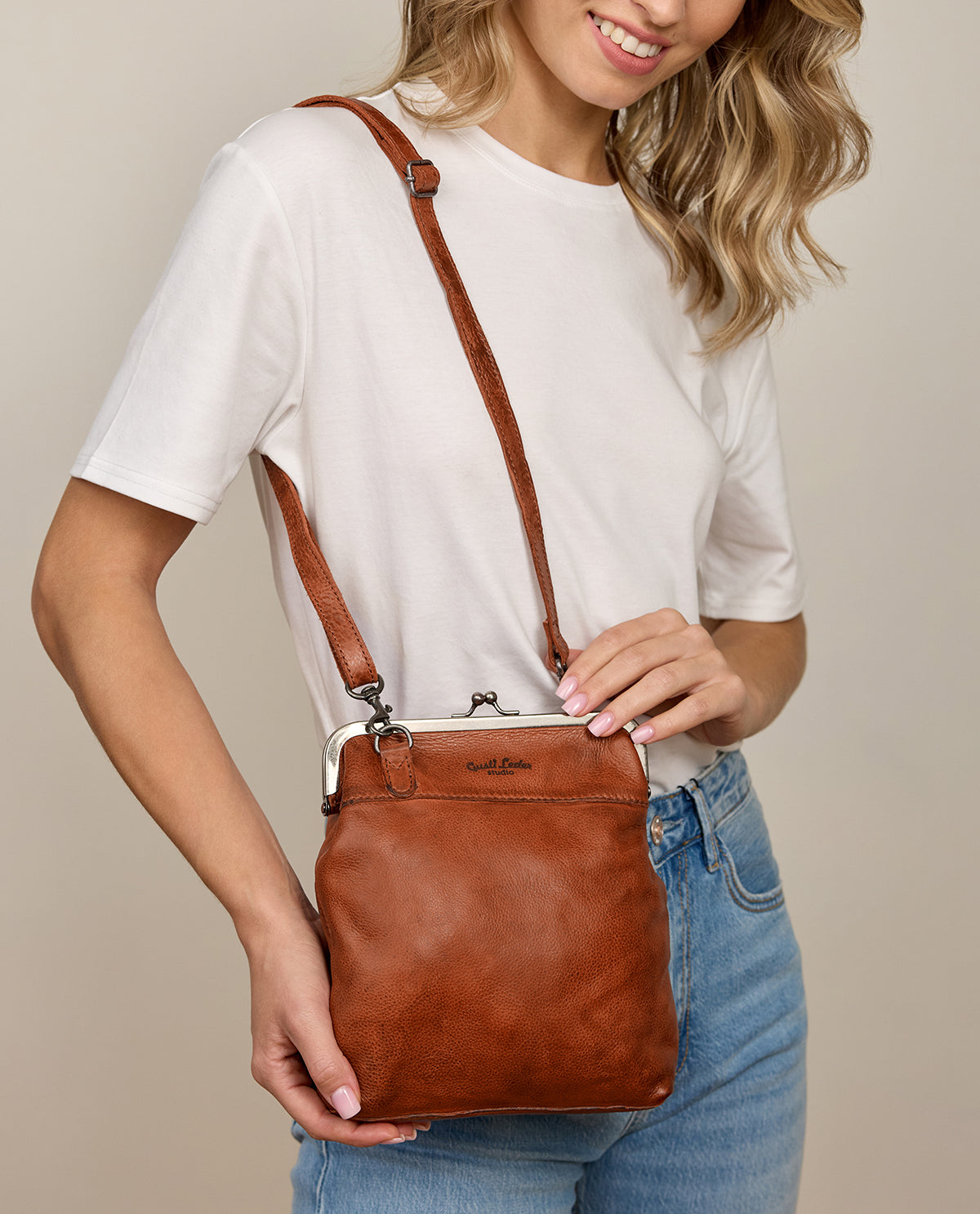 Do you like things grounded but with a touch of flair? Casual with a hint of uniqueness? Allow us to introduce – "Karlotta"! Your new wallet-style bag. For that extra dose of retro in your everyday life – try "Karlotta," inspired by the Berlin city flair. It brings urban style and functionality into your life, whether on a stroll or shopping in the city. Inside, the bag impresses with a large main compartment and a retro metal clasp. This keeps your belongings secure and well-protected. The durable cowhide leather completes the design. Notebooks, smartphone, lipstick, and wallet all fit comfortably inside.