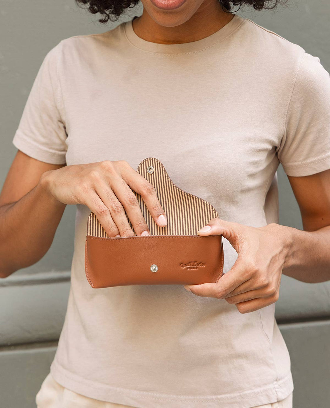 With “Cornelius” you can store your glasses safely and stylishly. This elegant glasses case made of high-quality brown leather combines protection and elegance in a timeless design. The robust construction ensures that your glasses are well protected from scratches and external influences. Thanks to its compact shape, “Cornelius” fits effortlessly into any bag, making it the perfect companion for on the go. Whether for everyday life, traveling, or at the office – this case is ideal for women and men who value stylish functionality.