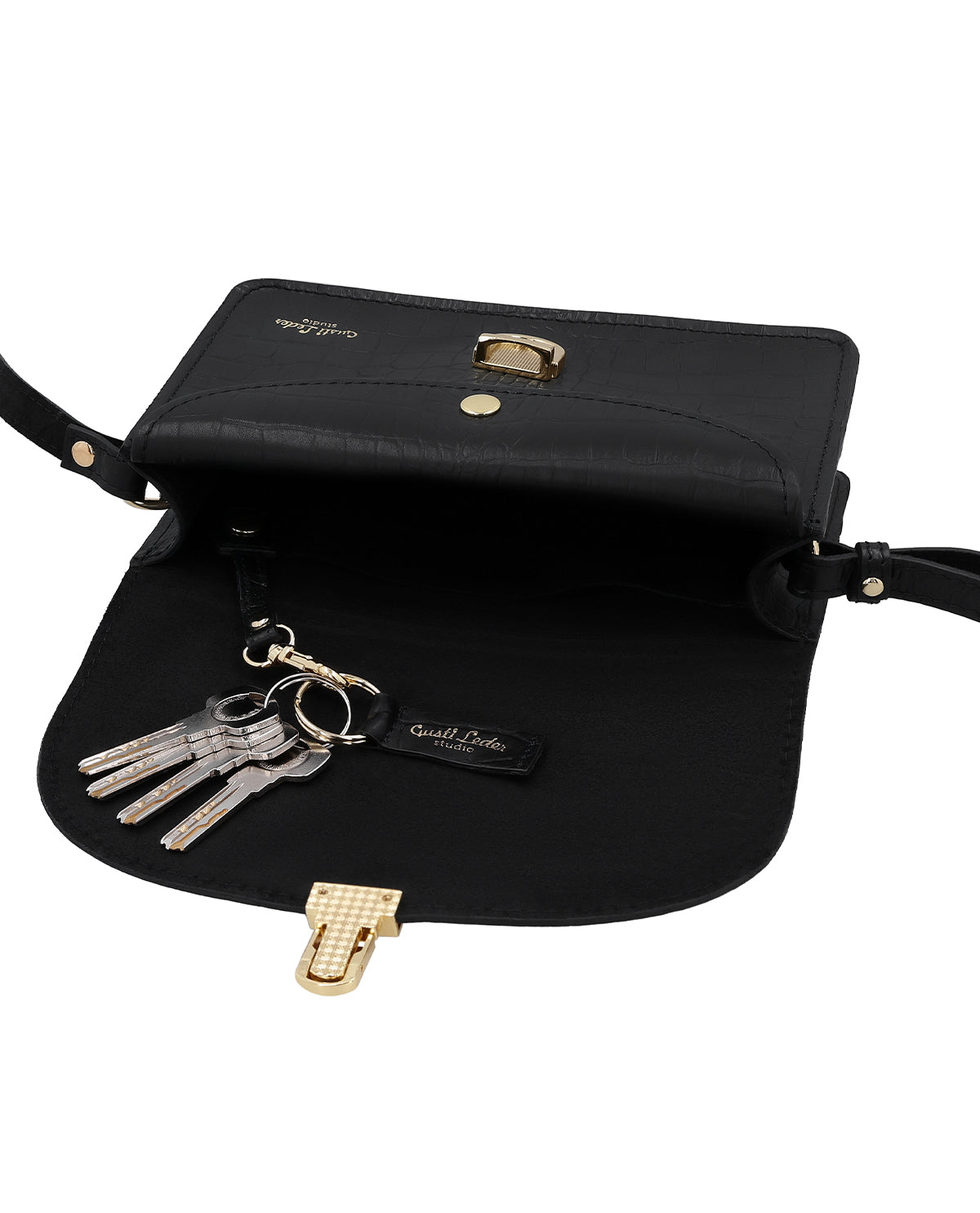 Are you looking for THE crossbody bag? One that can be used day and night? A bag that levels up any outfit? “Sandy” to the rescue! Her slim size makes her the perfect shoulder bag. The crocodile-skin look makes this black cowhide leather bag stand out, no matter where you are. She’ll win you over with a pop of colour and her subtle gold appliqué.