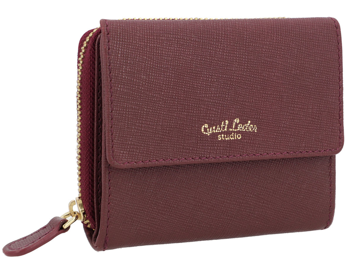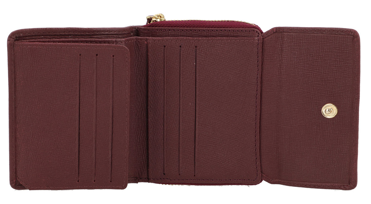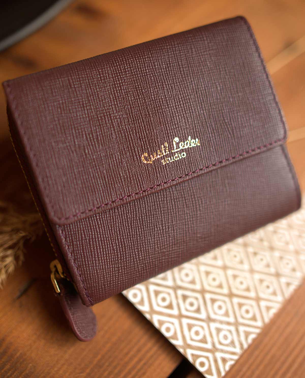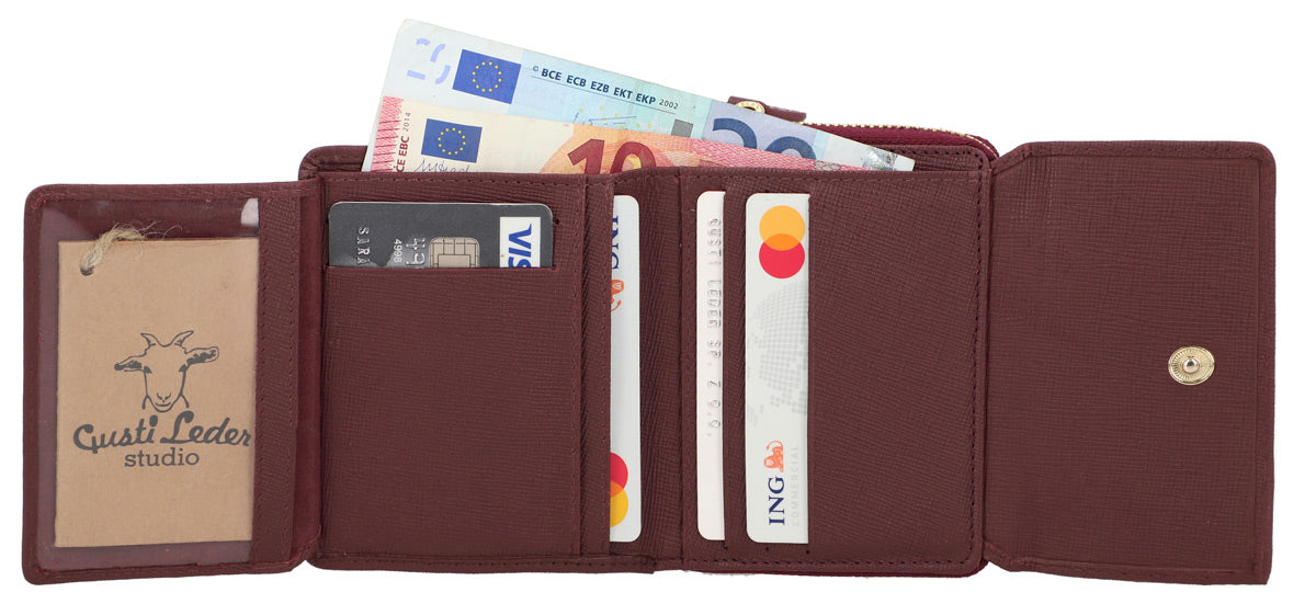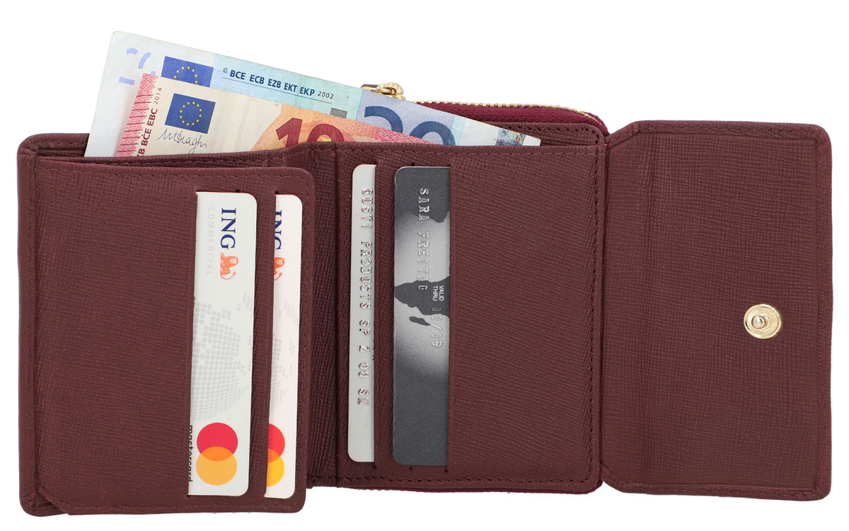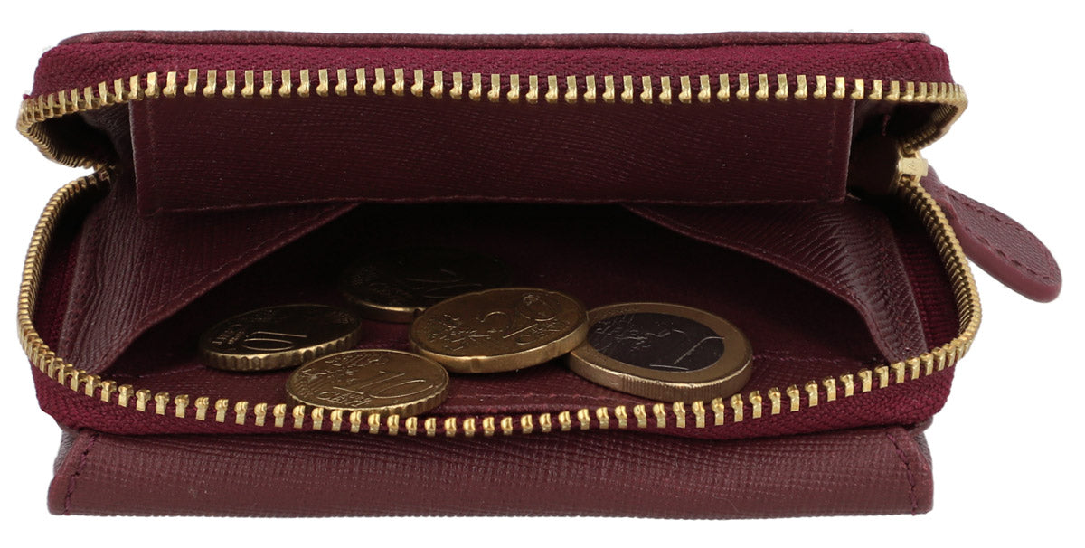 Inside, "Brigitta" features a bill compartment, a fold-out window, space for up to six cards, and a separate zippered coin pocket. This prevents your money from falling into your pocket. Made of high-quality cowhide leather with a saffiano design, the wallet closes with a snap fastener. Into your bag, ready to go—with the "Brigitta" wallet!