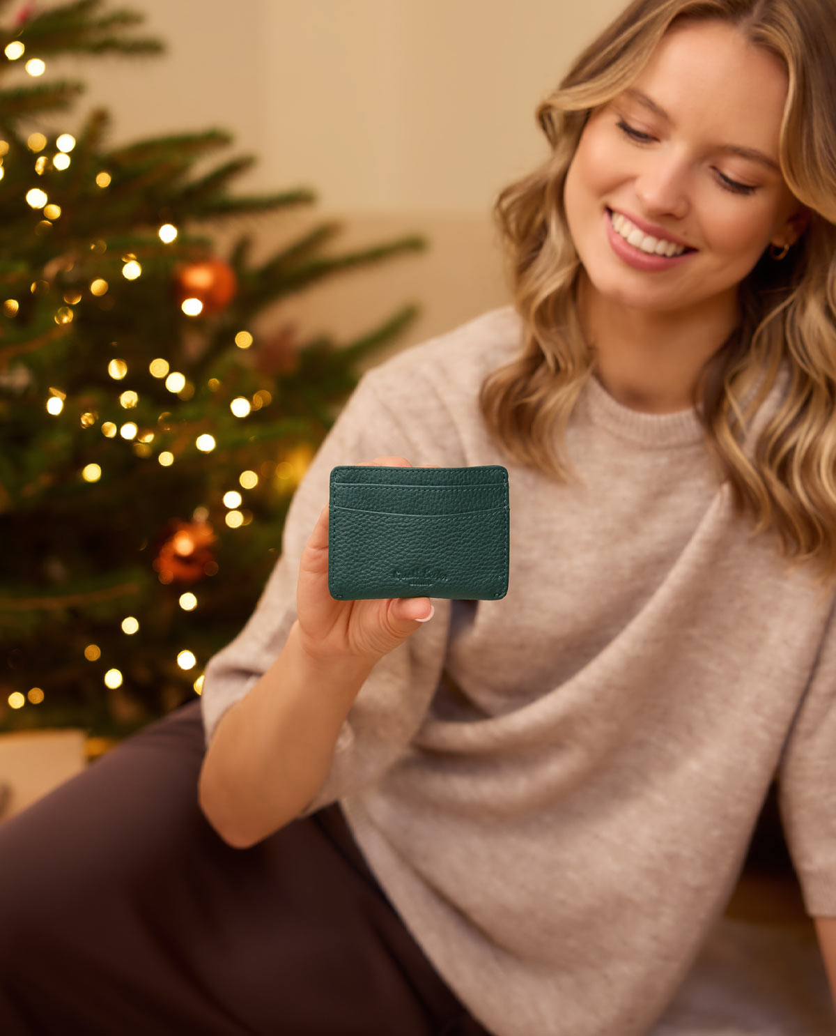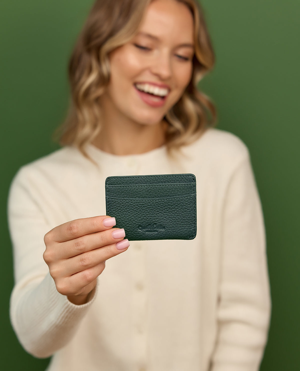 The "Qani" card case is the perfect choice for those who value organization and elegance. Made from high-quality dark green leather, it impresses with its compact size and elegant design. The noble color and fine craftsmanship make it a stylish accessory that is not only functional but also a real eye-catcher. With this card case, you always have everything important with you - and in the best quality.