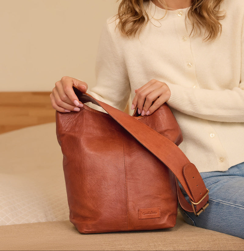 私たちの革バッグ 「カレン」 時代を超越したスタイルと賢い機能を 1 つに組み合わせたものです。 3 つの独立したコンパートメントに最も重要なものを安全に保管し、簡単に手の届くところに保管します。追加のキャリングストラップを使用すると、柔軟に肩に掛けたり、手に快適に持ち運んだりできます。エレガントな柄が目を惹く「Caren」は、装いをスタイリッシュに仕上げるアクセサリーです。