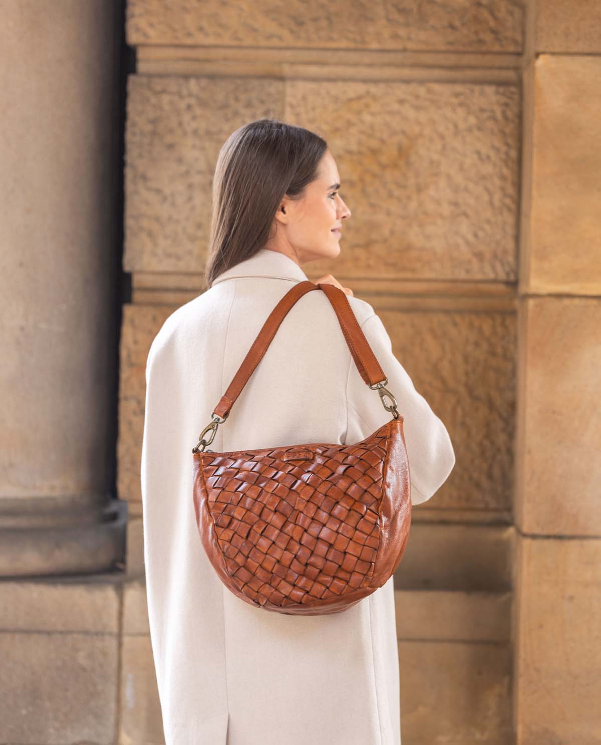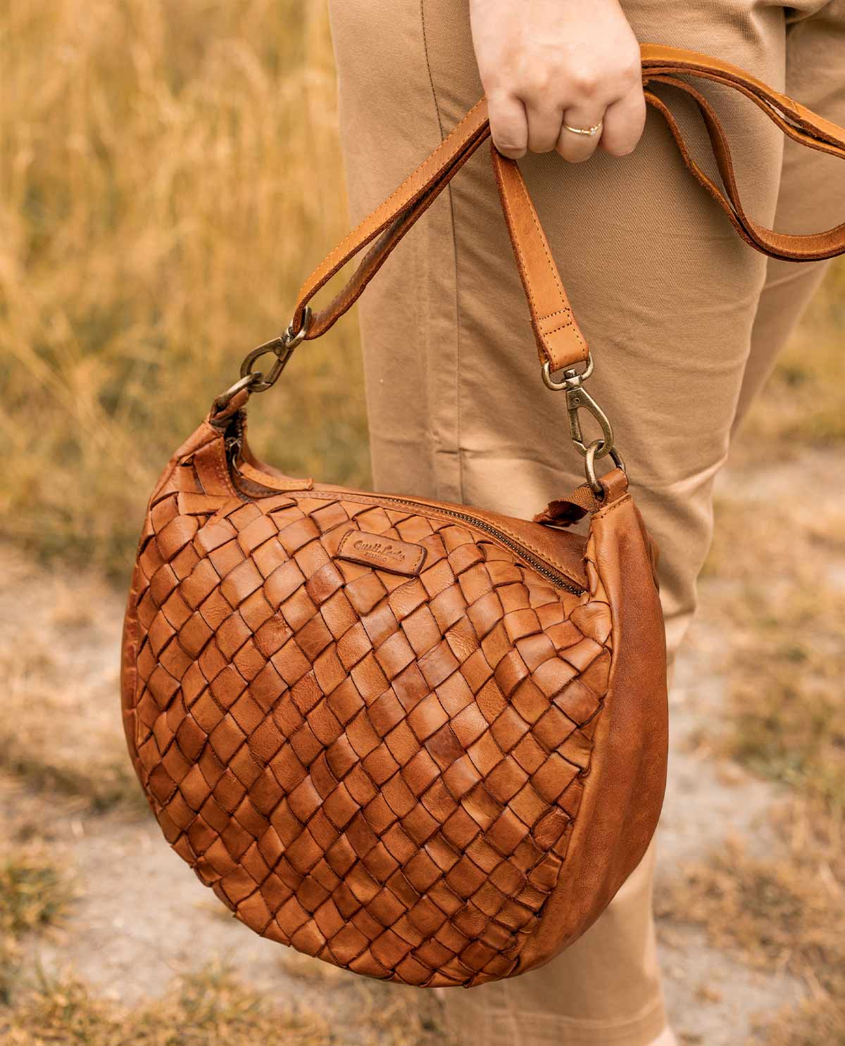 「Clover」は丈夫な牛革と粗めの編み込みデザインが目を引く一品です。メインコンパートメントは8リットルの容量があり、小さなノート、鍵、財布、リップスティック、スマートフォンが収まります。周囲を囲むファスナーが大切な持ち物をしっかりと守り、外に飛び出すのを防ぎます。さっと肩にかけて、さあ出発!自然の中でも都会の喧騒の中でも、「Clover」はいつでも一緒です。