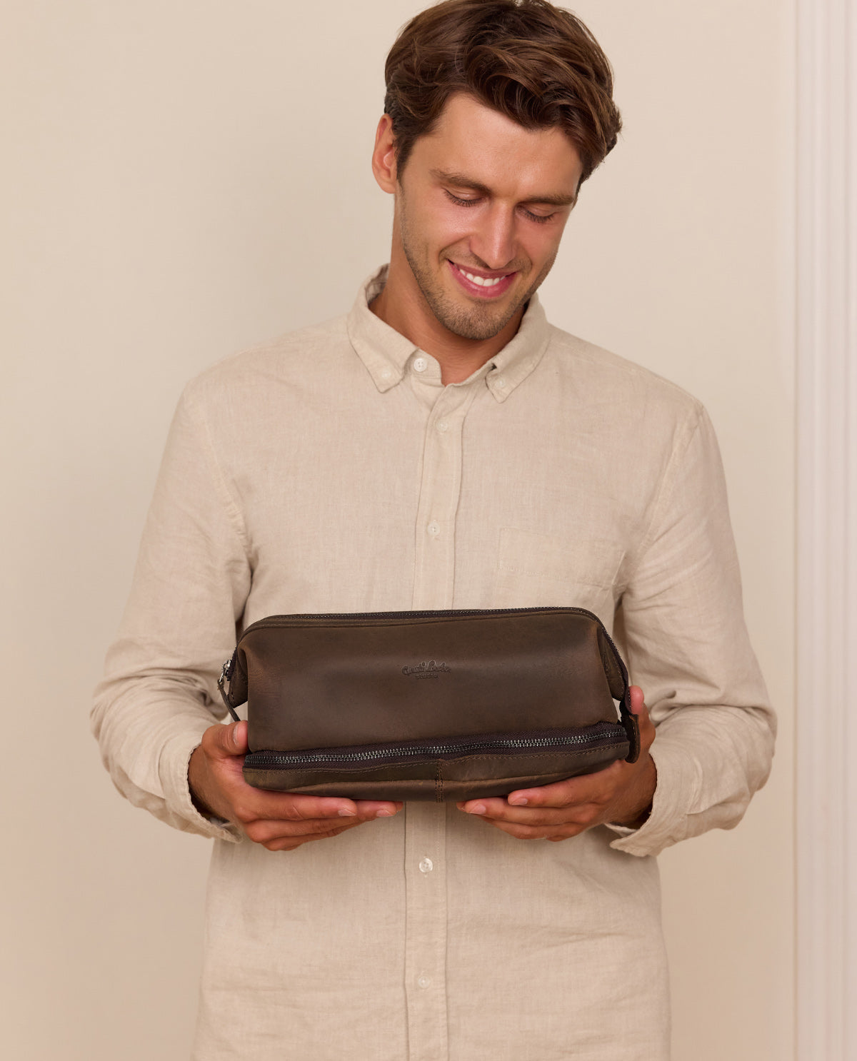 「Quinn」トイレタリーケースは、旅行や外出時に最適なパートナーです。高品質なレザーの外観と計算されたデザインで、あなたのケア用品を収納できるだけでなく、旅行鞄にもエレガントなアクセントを加えます。