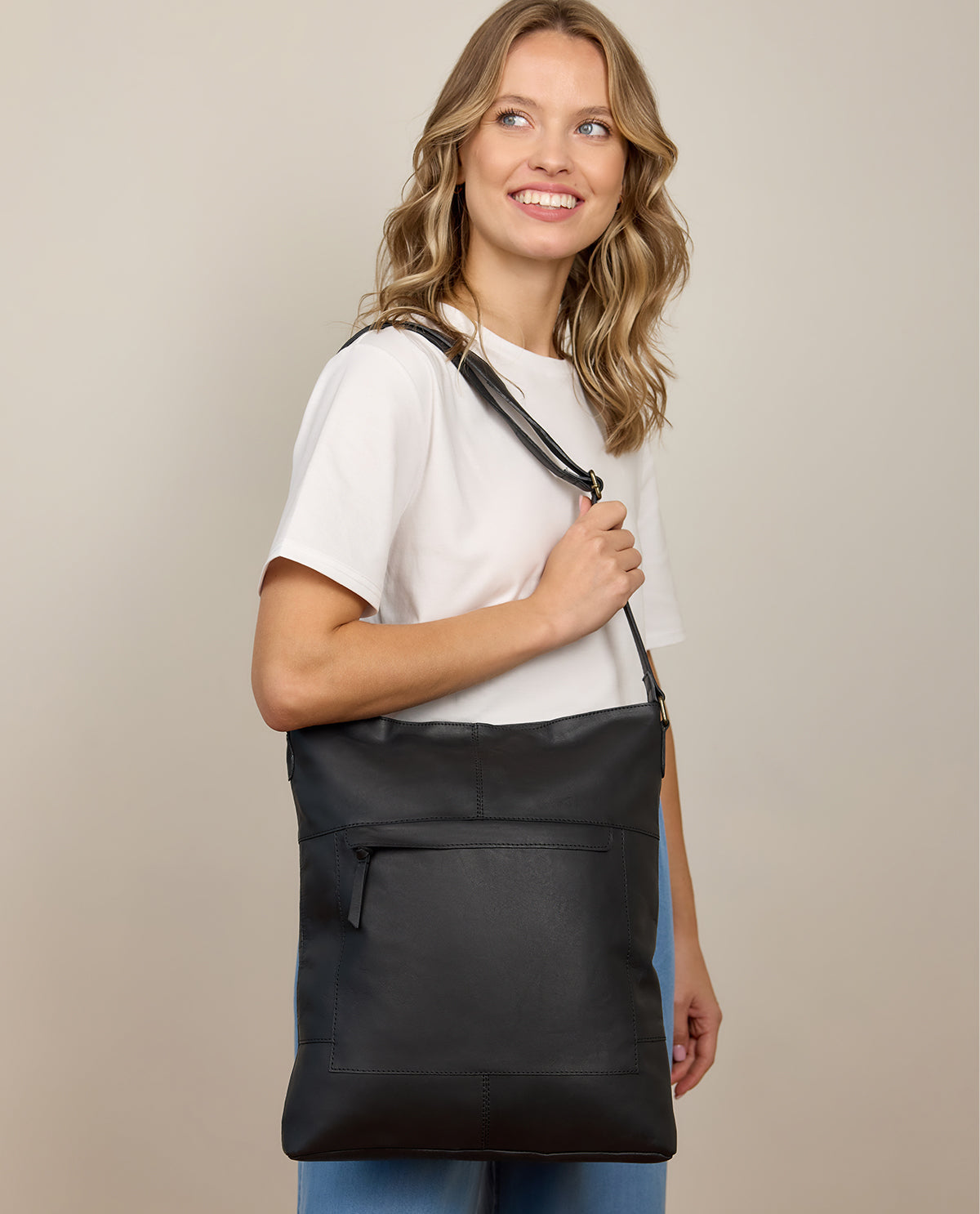 このたっぷりとしたメインコンパートメントを持つ高品質なとても柔らかい牛革製のショルダーバッグには、A4サイズまでの書類を簡単に収納できます。また、追加のスリップポケットや内側のファスナーポケットもあり、必要なものが整理整頓され、探す手間が省けます。しっかりした幅広のファスナーで、持ち物を安全に収納し、しっかり保護します。さらに、前面にはもう一つのファスナーポケットがあり、スマートフォンやイヤホンなど、すぐに取り出したい小物を簡単に収納できます。長さ調整可能なショルダーストラップで、ショルダーバッグとしてもクロスボディバッグとしても使用可能です。