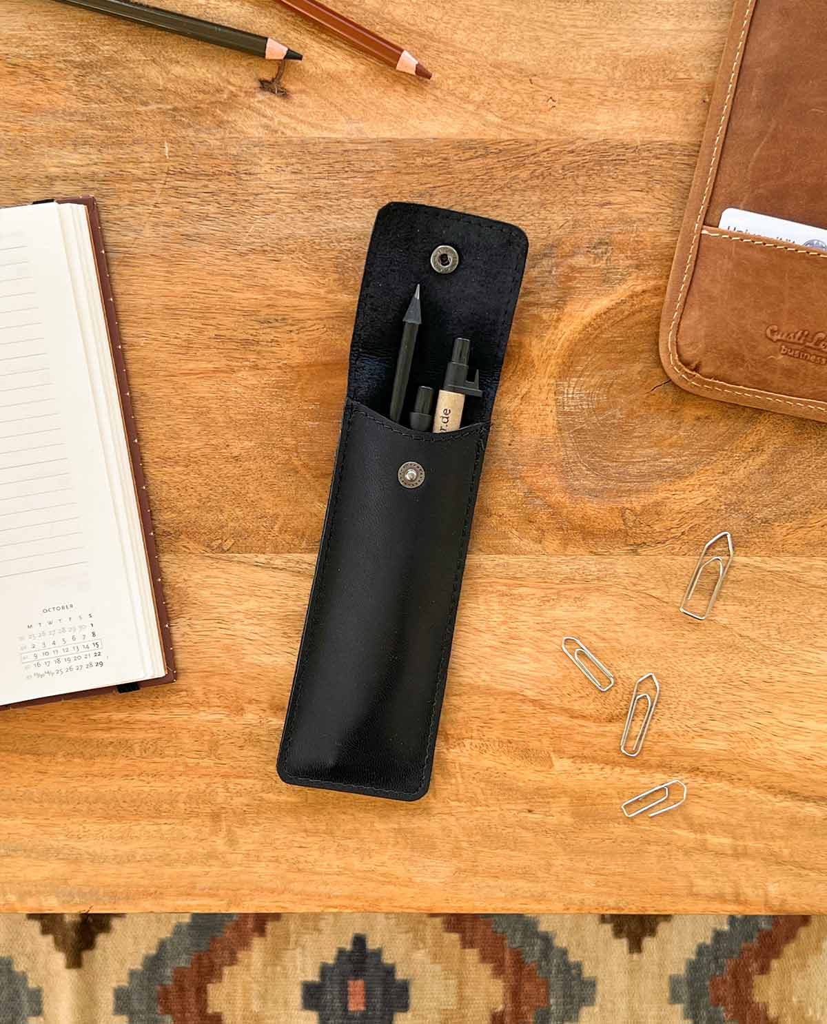 Nur deine absoluten Lieblingsstifte finden hier Platz! Im bewusst sehr reduzierten Design bietet dir "Ambrose" genau das - eine funktionalen stylischen Ort für den Stift, den du immer parat haben musst. Das hochwertige Rindsleder überzeugt als robustes und stabiles Material. Im Inneren hast du Platz für die wichtigsten Stifte für die Uni oder Arbeit.