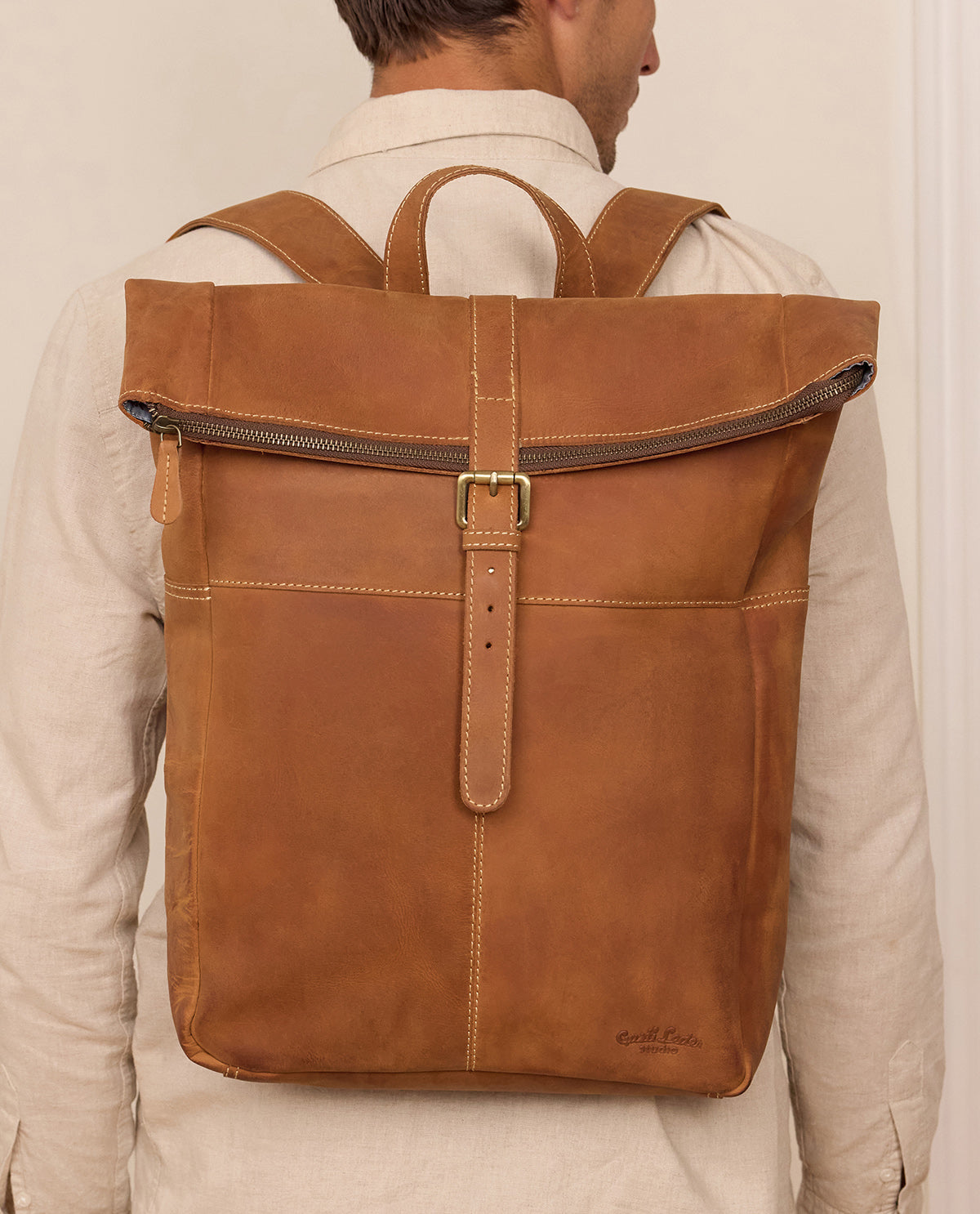 "Henning" ist ein mittelgroßer Rolltop-Rucksack aus widerstandsfähigem Büffelleder, der durch seinen schlanken Schnitt perfekt für das Großstadtgewirr oder die Enge der S-Bahn zur Rush Hour geeignet ist. Die durchdachte Aufteilung bietet Dir ausreichend Raum, um Deine DIN A4-Unterlagen, Dein 15-Zoll-Notebook, mehrere Bücher und eine große Trinkflasche im geräumigen Hauptfach zu verstauen. Zusätzlich helfen Dir ein Steckfach und ein Reißverschluss-Innenfach, Deine Habseligkeiten organisiert zu halten. Sollte mal etwas auslaufen, schützt der helle Innenstoff aus wasserfestem Polycotton das Leder vor Nässe und Flecken. Das seitliche Reißverschlussfach außen bietet Platz für Dinge, die Du schnell griffbereit haben möchtest. Die gepolsterte Rückenpartie und die Innenseite der breiten Schulterriemen sind mit braunem Canvas bezogen und sorgen für eine Extraportion Tragekomfort.