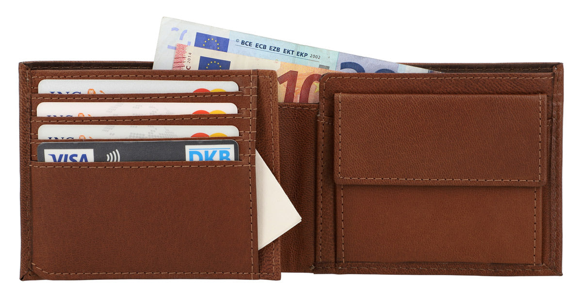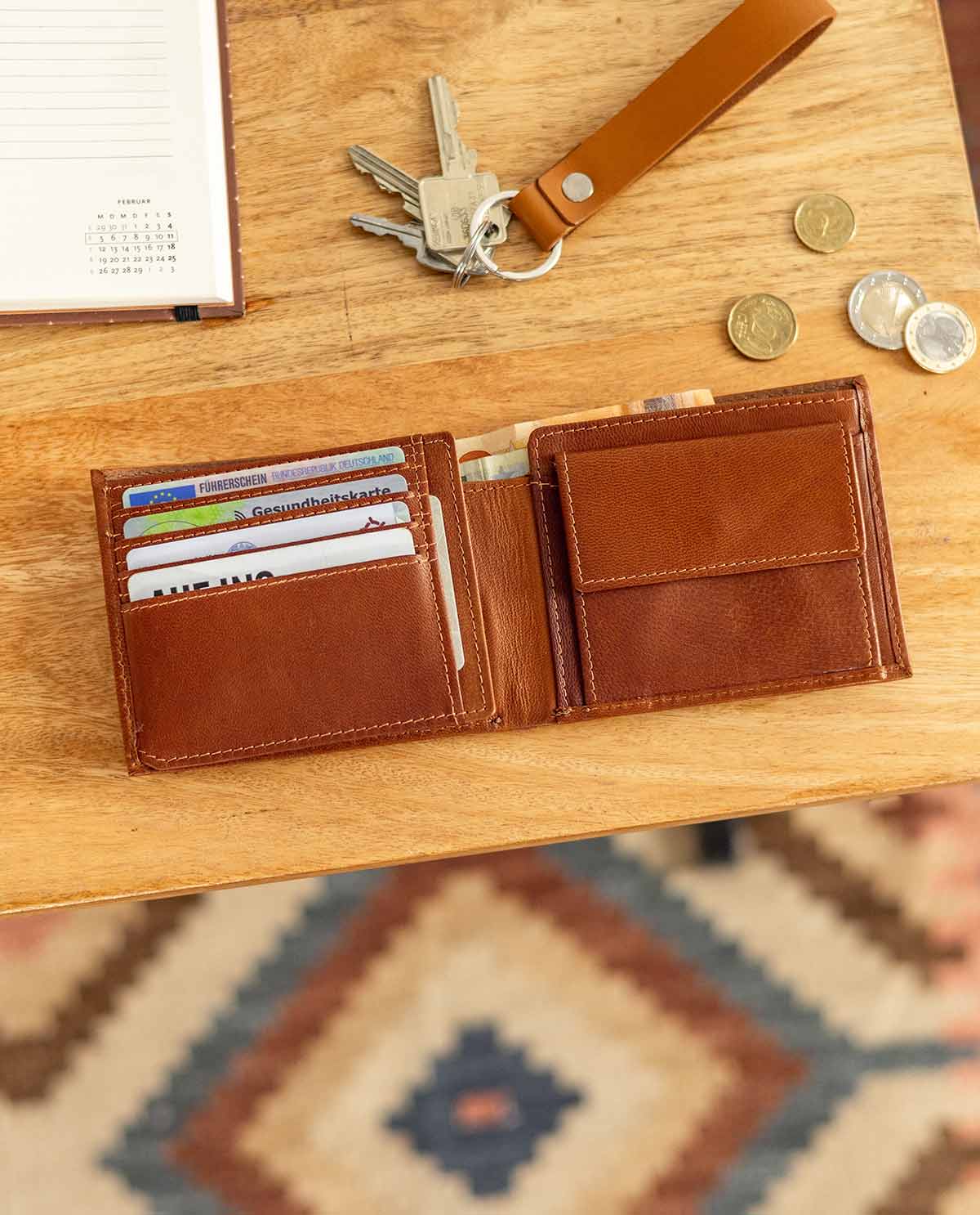 Im Inneren überzeugt das Portemonnaie mit einem sehr gut strukturierten Ordnungssystem aus zwei Geldscheinfächern, einem separaten Münzfach, das über einen Druckknopf geöffnet werden kann, und insgesamt 9 Steckfächern für (mindestens) ebenso viele Karten. Ein außerdem integriertes Flipfach erweitert die Börse noch zusätzlich um ein großes Sichtfenster, in dem problemlos Ausweis, Führerschein oder auch Fotos von den Liebsten untergebracht werden können. Und ein weiteres "Nice-to-have": die Größe von "Jörg" eignet sich auch hervorragend, um beispielsweise auch Fahrzeugpapiere unterzubringen, ohne sie zu falten und dadurch zu zerknicken.