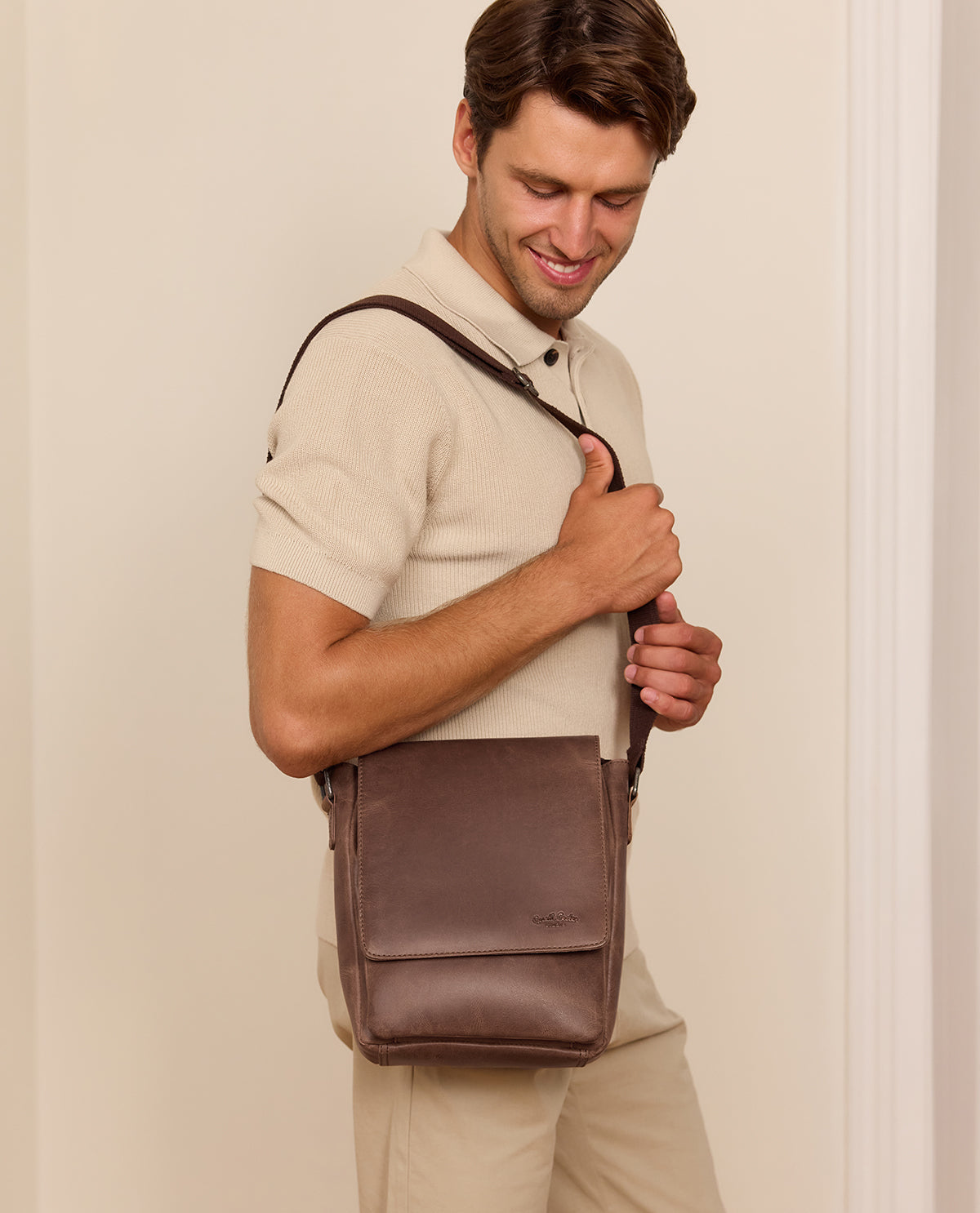 このバッグには、特別で高品質なレザーを使用。丈夫でありながら手触りは柔らかく、使い込むほどに美しいパティーナ(経年変化)が生まれます。長さ調整可能なショルダーストラップにより、体型に合わせた快適なフィット感を実現。前面に施されたGusti Lederのエンボスロゴが、上品で洗練された印象を添えます。スタイルと整理力、そのどちらも妥協しない一品です。